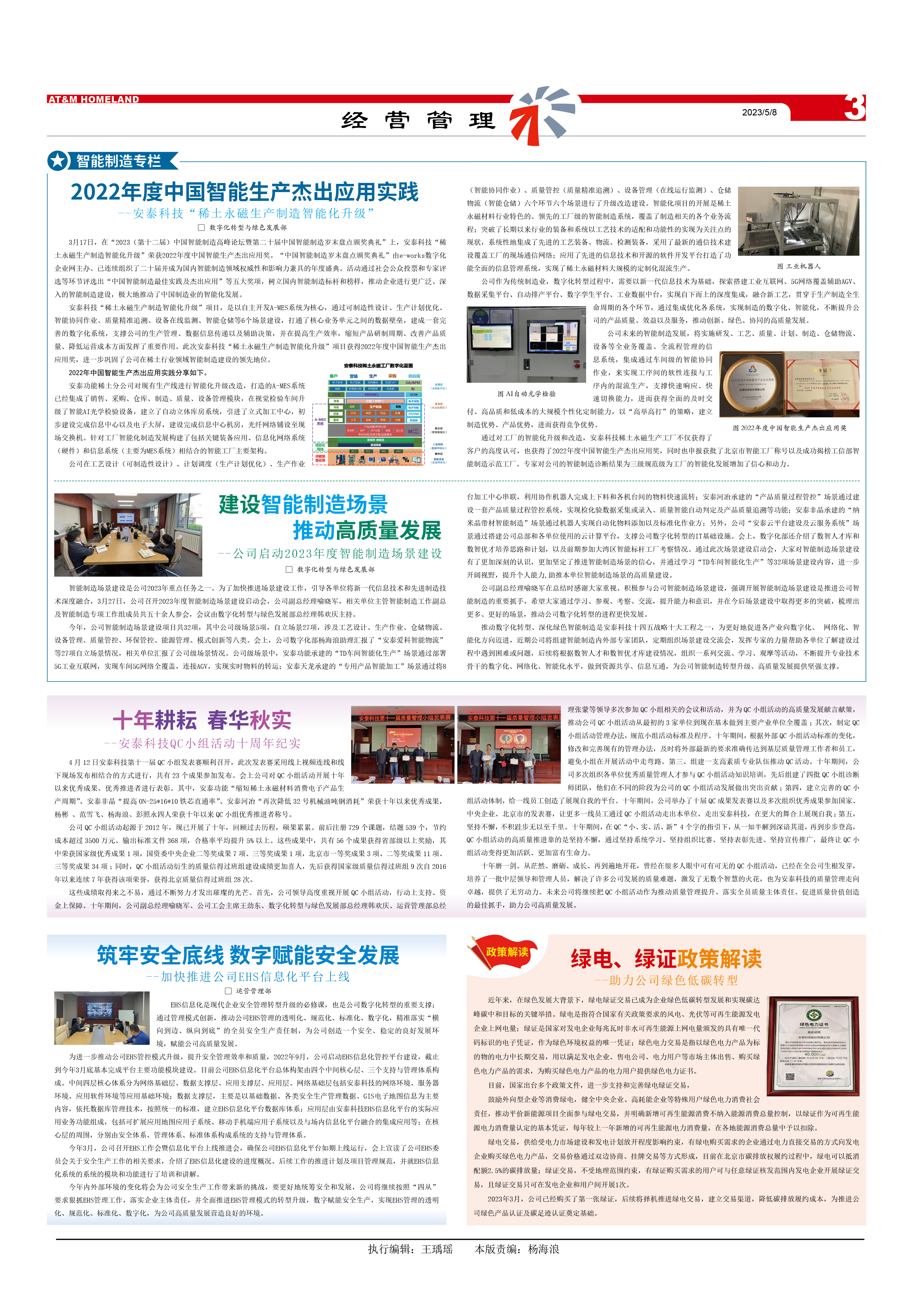 安泰科技“稀土永磁生產(chǎn)制造智能化升級(jí)”項(xiàng)目,是以自主開發(fā)A-MES系統(tǒng)為核心,通過可制造性設(shè)計(jì)、生產(chǎn)計(jì)劃優(yōu)化、智能協(xié)同作業(yè)、質(zhì)量精準(zhǔn)追溯、設(shè)備在線監(jiān)測、智能倉儲(chǔ)等6個(gè)場景建設(shè),打通了核心業(yè)務(wù)單元之間的數(shù)據(jù)壁壘,建成一套完善的數(shù)字化系統(tǒng),支撐公司的生產(chǎn)管理、數(shù)據(jù)信息傳遞以及輔助決策,并在提高生產(chǎn)效率,縮短產(chǎn)品研制周期、改善產(chǎn)品質(zhì)量、降低運(yùn)營成本方面發(fā)揮了重要作用。此次安泰科技“稀土永磁生產(chǎn)制造智能化升級(jí)”項(xiàng)目獲得2022年度中國智能生產(chǎn)杰出應(yīng)用獎(jiǎng),進(jìn)一步鞏固了公司在稀土行業(yè)領(lǐng)域智能制造建設(shè)的領(lǐng)先地位。