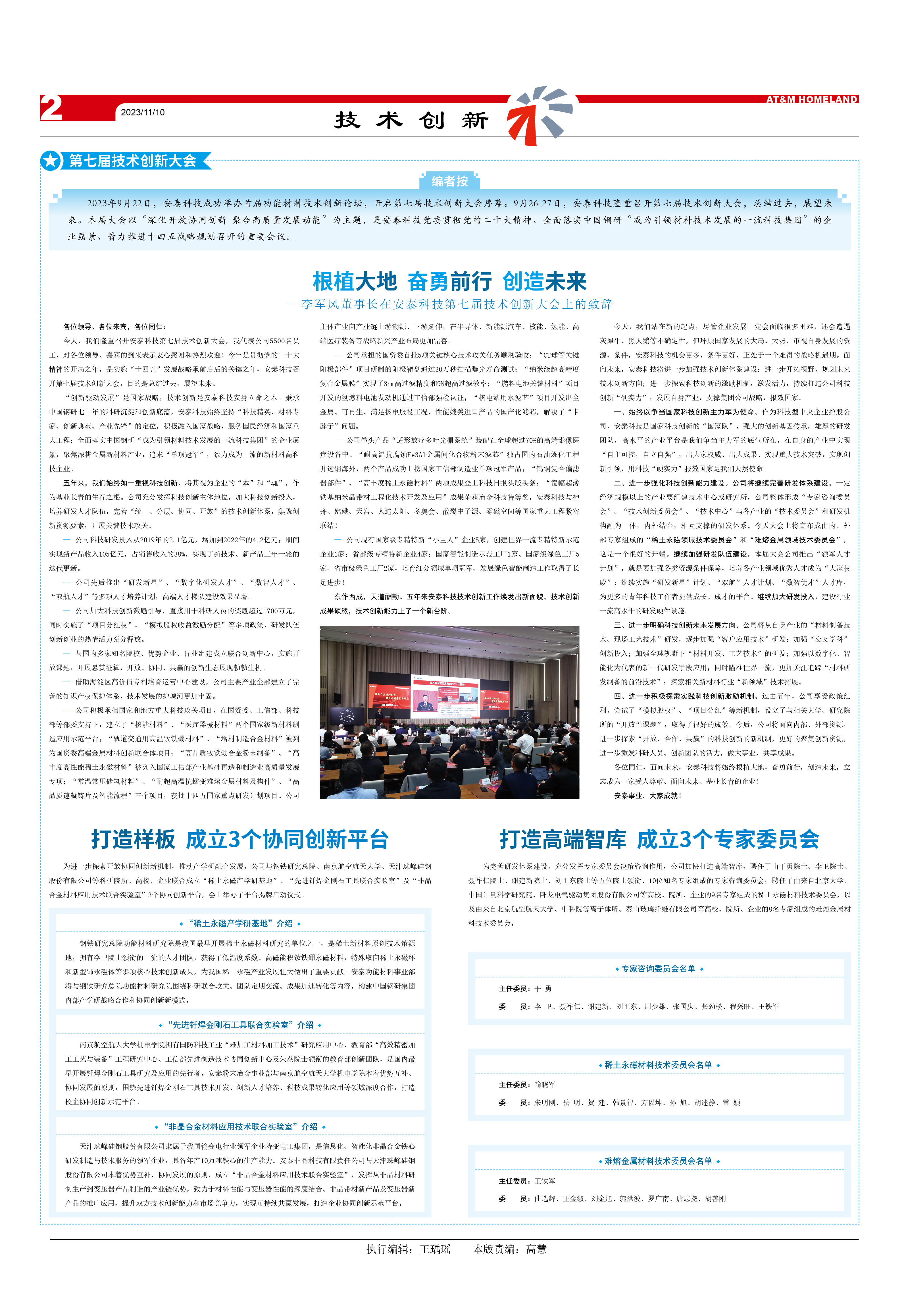 2023922日,安泰科技成功舉辦首屆功能材料技術創新論壇,開啟第七屆技術創新大會序幕。9月26-27日,安泰科技隆重召開第七屆技術創新大會總結過去,展望未來。本屆大會以“深化開放協同創新 聚合高質量發展動能”為主題,是安泰科技黨委貫徹黨的二十大精神、全面落實中國鋼研“成為引領材料技術發展的一流科技集團”的企業愿景、著力推進十四五戰略規劃召開的重要會議。